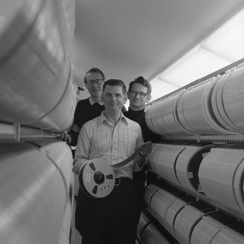 - NCAR Graphics and NCL Records / Photographs, 1971-1995, undated / Photographic prints, large-format, 1971-1984, undated / 36: Bob Biro, Stu Patterson, and Paul Rotar, with Ampex computer tapes [2871-2], 1975-04-01