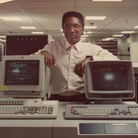 - NCAR Graphics and NCL Records / Photographs, 1971-1995, undated / Photographic prints, small-format, 1988-1992, undated / 18: Dick Lindenmoyer with computing equipment [8347-13], 1991-09-12