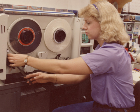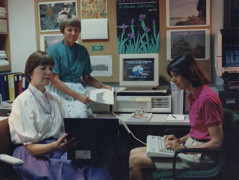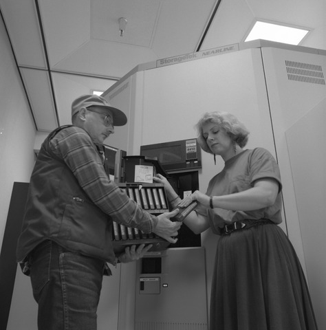 - NCAR Graphics and NCL Records / Photographs, 1971-1995, undated / Photographic prints, small-format, 1988-1992, undated / 16: Dick Lindenmoyer and Sue Long (Sue Jensen) with computing media [8347-16], 1991-09-12
